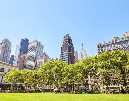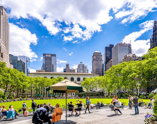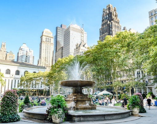 A beloved Midtown oasis, Bryant Park offers tree-lined paths, open lawns, and seasonal activities like winter skating and summer movies.