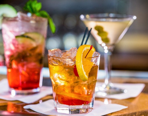Craft cocktails and upscale bar bites in a stylish, dimly lit space.
