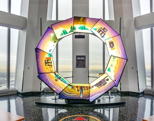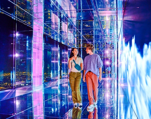 A multi-level observation deck with mirrored rooms, art installations, and dramatic city vistas.