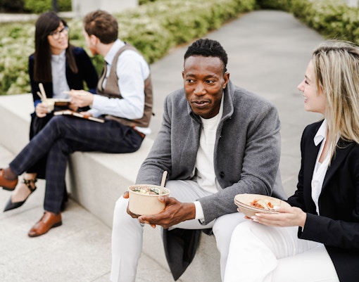 A pocket park with tables, food kiosks, and a lively lunchtime crowd.