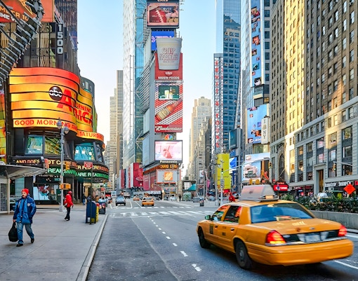 The city’s neon heart, Times Square buzzes with lights, street performers, and Broadway theaters.